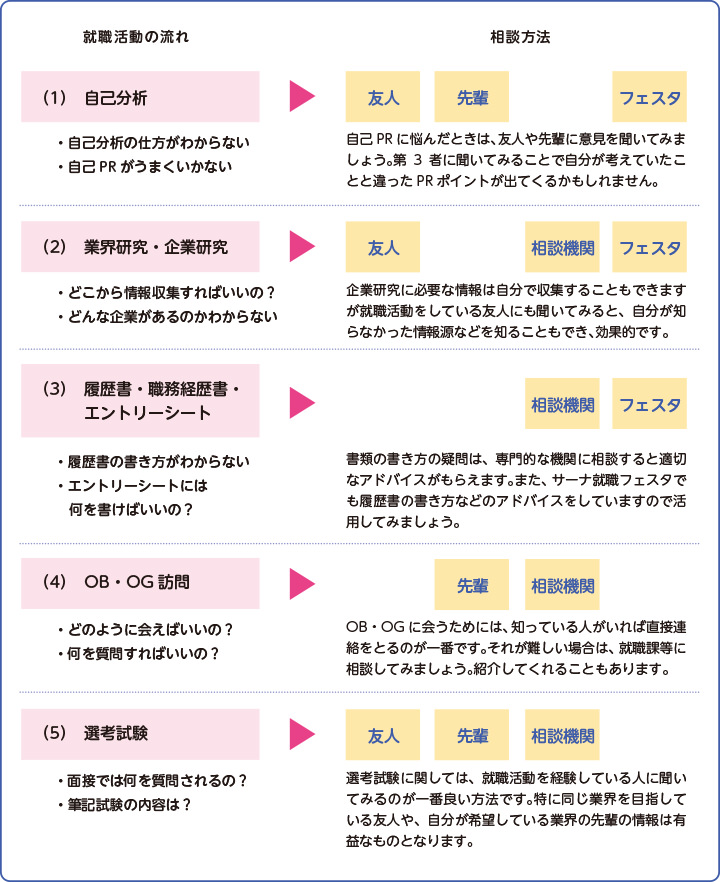 初めて就職活動を行う人はもちろん、就職活動の流れが理解できている人でも、就職活動で困ったと感じたことはあるはずです。就職活動で困ったことがあった際は、まず誰に(どこに)相談すべきか、必要な情報は何かを整理してみましょう。知りたいこと・困っていることによって相談や情報交換の方法は異なります。悩みをスムーズに解決するために、事前に整理するのを忘れないようにしましょう。